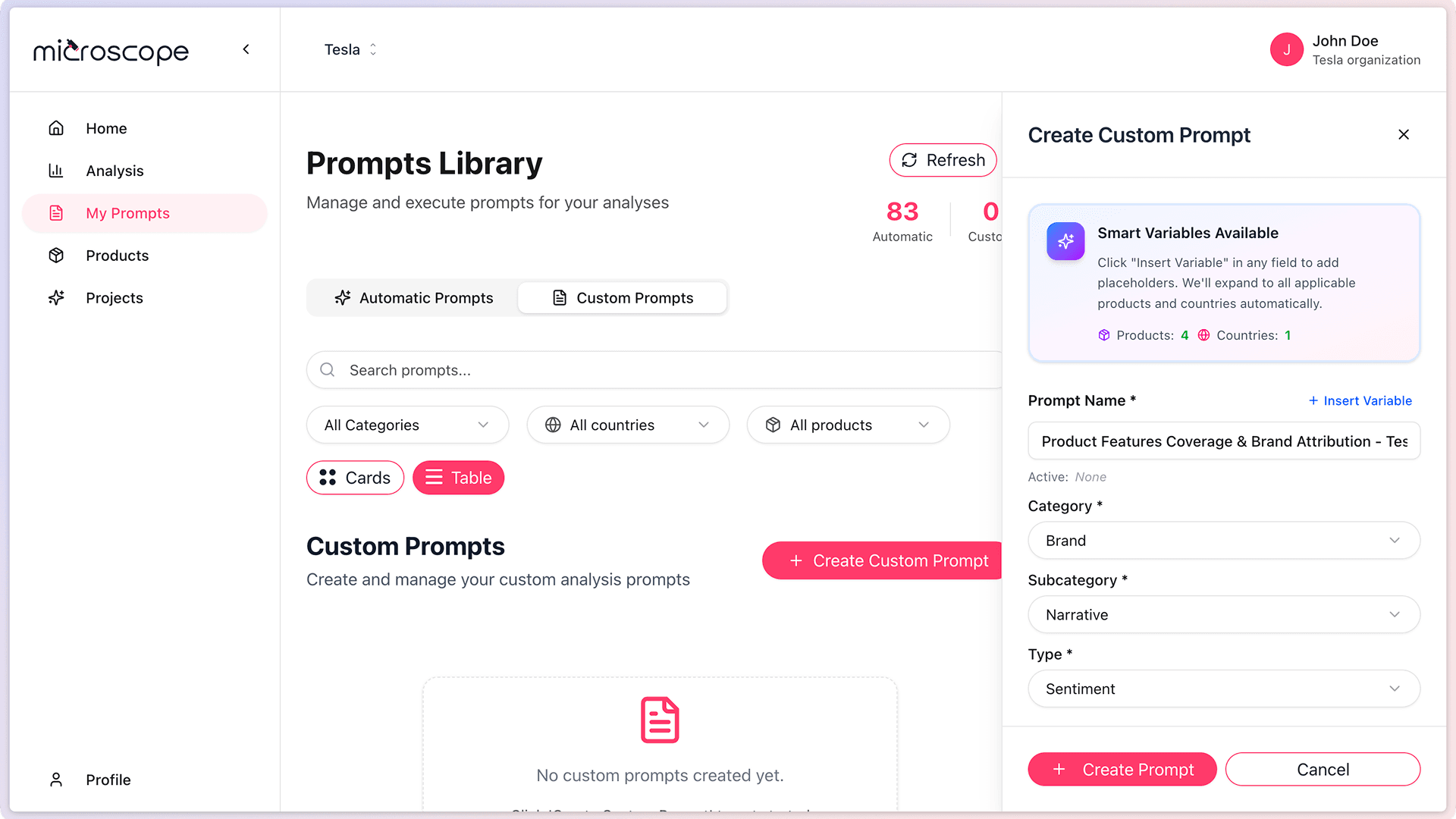 Custom prompts allow you to monitor specific scenarios, campaigns, or competitive dynamics unique to your business. This guide explains how to create effective custom prompts step by step.